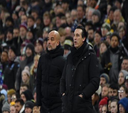 曼城队主教练瓜迪奥拉(左)与阿斯顿维拉队主教练埃梅里在场边观战 新华社/美联